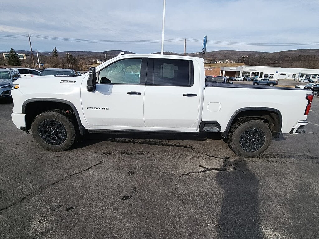 includes LED lighting, includes (A50) bucket seats with (D07) center console, (KQV) heated and ventilated front seats, (QT6) power up/down tailgate, (UF2) bed LED cargo area lighting, (UBC) USB Ports, (UQA) Bose Premium Audio System and (K4C) Wireless Charging, includes (UD7) Rear Park Assist, (UKV) Trailer Side Blind Zone Alert and (UFG) Rear Cross Traffic Alert Includes (HS1) Safety Alert Seat, (UV2) HD Surround Vision, (UVN) Bed View Camera and (TRG) Trailer Camera Provisions.), includes (DRZ) Rear Camera Mirror and (UV6) Multicolor 15" Diagonal Head-Up Display, includes (A48) Rear sliding power window, (UG1) Universal Home Remote, (KA6) Rear heated seats and (KSG) Adaptive Cruise Control. includes body-color grille bar with "Chevy Black Bow Tie", Black grille inserts, Z71 badge, Black skid plate, Black Silverado, trim level and tonnage badging, Black bowtie on horn pad, Black "Silverado" and "LT" badges on tailgate, Black "2500" on doors, (DP6) painted mirror caps, Black hood vent surround, (VB5) painted front bumper, (VT5) painted rear bumper, (PTW) 18" high gloss Black aluminum wheels, (QF6) LT275/70R18E all-terrain, blackwall tires, (CGN) Chevytec spray-on bedliner and (RVS) 4" Black assist steps, LPO Includes Black beltline moldings, (D75) Gloss Black painted door handles. Beginning in May 2024 through end of 2024 model year, certain vehicles will be forced to include (RVQ) Black tubular assist steps, LPO in place of (RVS) Assist steps, LPO. See the window label for the, with Google built-in compatibility (select service plan required, terms and limitations apply) including navigation capability, 13.4" diagonal HD color touchscreen, includes multi-touch display, AM/FM stereo, Bluetooth® streaming audio for music and most phones; featuring Wireless Apple CarPlay® and Wireless Android Auto® capability for compatible phones, advanced voice recognition, in-vehicle apps, personalized profiles for infotainment and vehicle settings (STD), with Direct Injection and Variable Valve Timing, gasoline, (401 hp [299 kW] @ 5200 rpm, 464 lb-ft of torque [629 N-m] @ 4000 rpm) (STD), (STD). Keyless Entry, Privacy Glass, Steering Wheel Controls, Electronic Stability Control, Heated Mirrors.